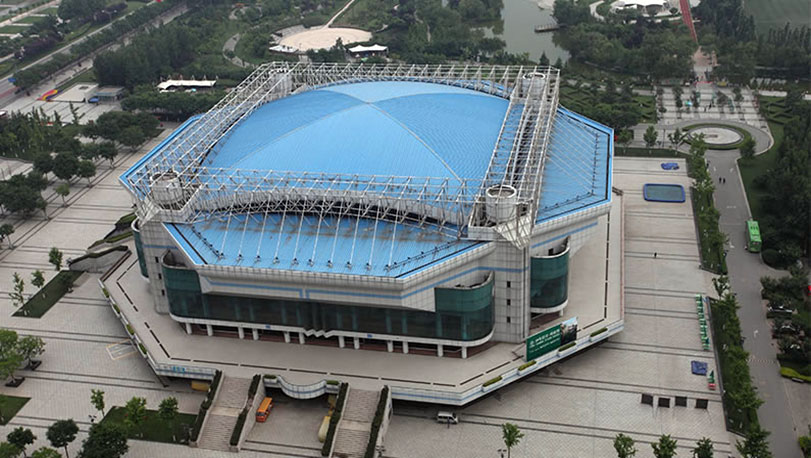 西安市體育館于1997年開始建設,1999年8月竣工。它是西安體育中心的標志性建筑,先后承辦了第四屆城市運動會體操比賽和閉幕式,中國東西部經濟合作與貿易洽談會開幕式等活動。采用寶鋼海藍PE聚酯彩涂。基板為180克/平方米的熱鍍鋅,牌號為TSt01。使用了12年后,涂層顏色依然鮮艷.