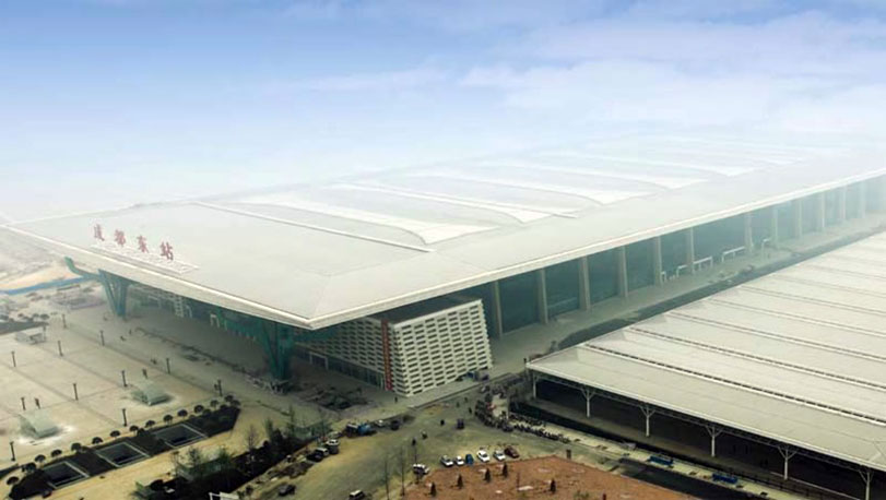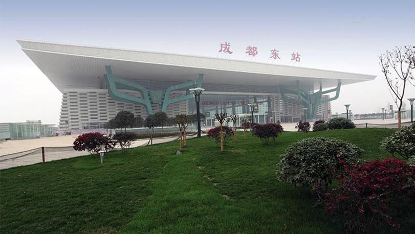 成都火車東站位于成都市東三環(huán)路,2010年開始建設(shè),車站面積約22萬平方米。在設(shè)計上引入了大量的文化元素,東、西廣場的進(jìn)出口都用了三星堆的青銅面具元素,屋頂引入了金沙太陽神鳥的火焰造型,被定為一等客運(yùn)站。使用了寶鋼鍍鋁鋅