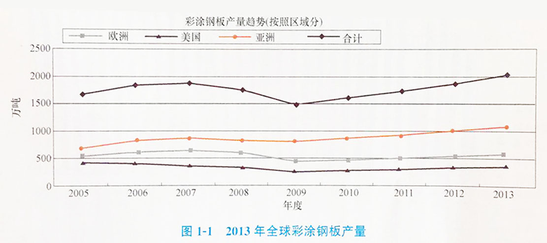 近年來,亞洲彩涂鋼板產量總體呈上升趨勢(圖1-4)。其中,中國大陸上升趨勢明顯,印度次之。2013年中國大陸彩涂鋼板產量超過500萬噸。由于亞洲產能的迅速增加,使大量產品流向歐美,影響了全球的彩涂鋼板產品市場。近二十多年進口到歐洲的彩涂鋼板量見圖1-5,2016年歐洲進口彩涂鋼板約73萬噸,主要來自韓國和印度:近十多年進口到美洲的彩涂鋼板量見圖1-6,2016年美國進口彩涂鋼板約45萬噸,主要來自韓國和中國臺灣。2013年以來中國大陸在這兩個主要市場的出口均因反傾銷而基本退出。