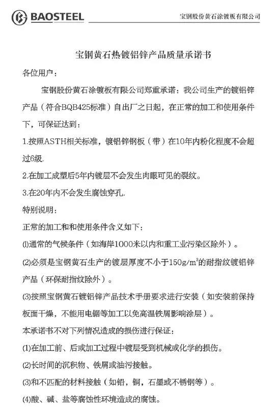 熱鍍鋁鋅20年產(chǎn)品使用承諾書(shū)